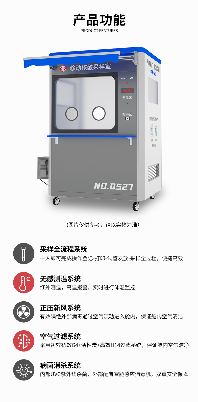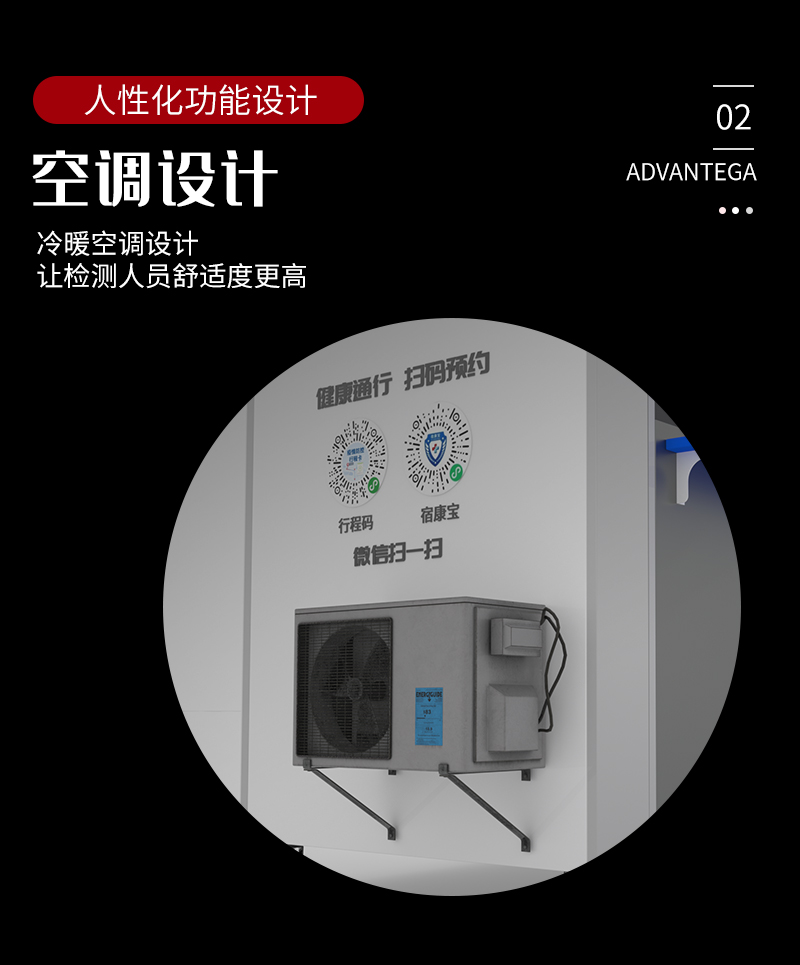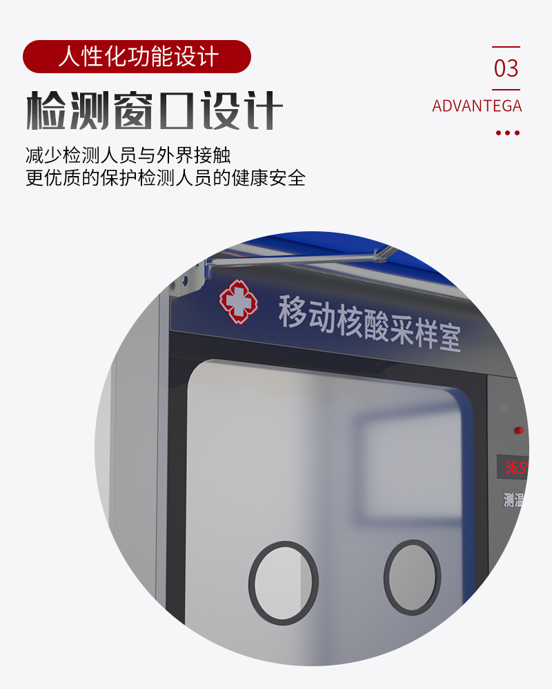 移动核酸采样室主要用于生物样本采样工作的安全防护,包括新冠病毒咽拭子采样。该产品可以广泛应用于疾控,医院,地铁,机场,高铁站,火车站,居民住宅等一系列室内外场所,部署迅速,移动便捷。